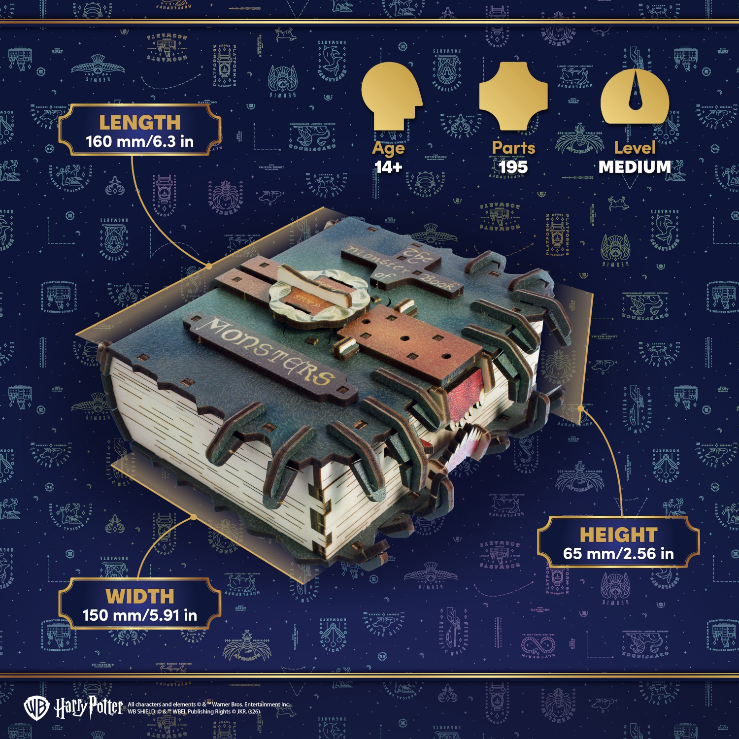 Build the Monster Book of Monsters — a dynamic 3D wooden puzzle that snaps, rolls, and comes “alive” just like in the Harry Potter™ films. Wind the pull-cord to launch the book forward as its cover claps open and shut and its eyes pop up. A fun build and a striking display piece for every wizarding fan.