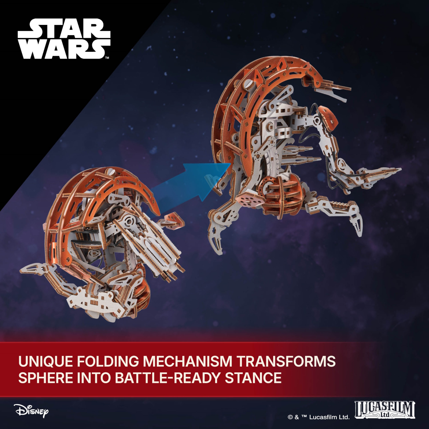 Build the iconic Droideka — a 3D wooden puzzle of the transforming destroyer droid from Star Wars™. Folds into a sphere and springs into battle mode!